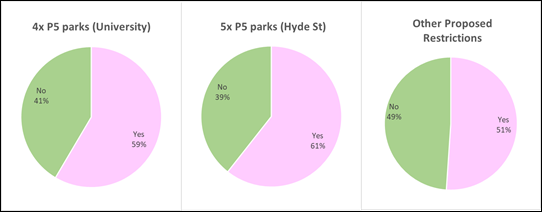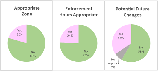 b) Around 20% of respondents preferred a smaller enforcement zone, suggesting the removal of off-street locations, certain streets, or limiting the zone to specific areas such as the Octagon.