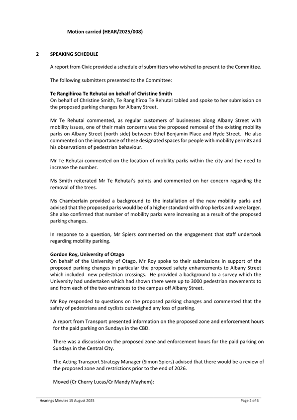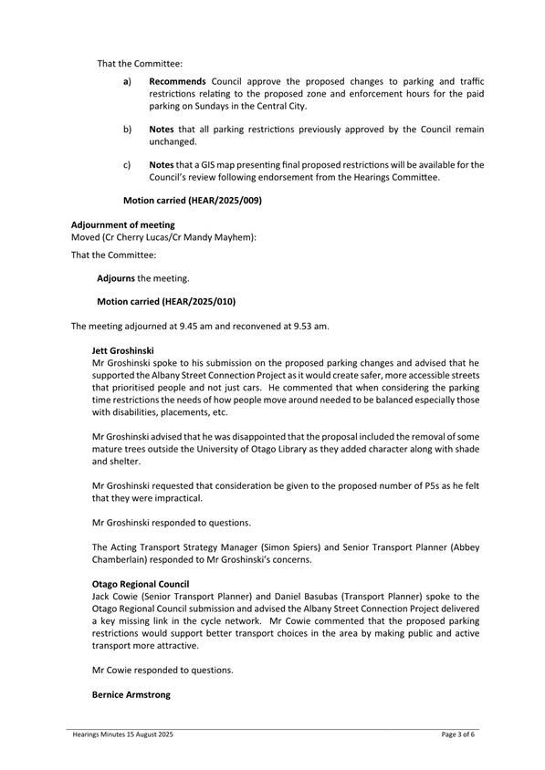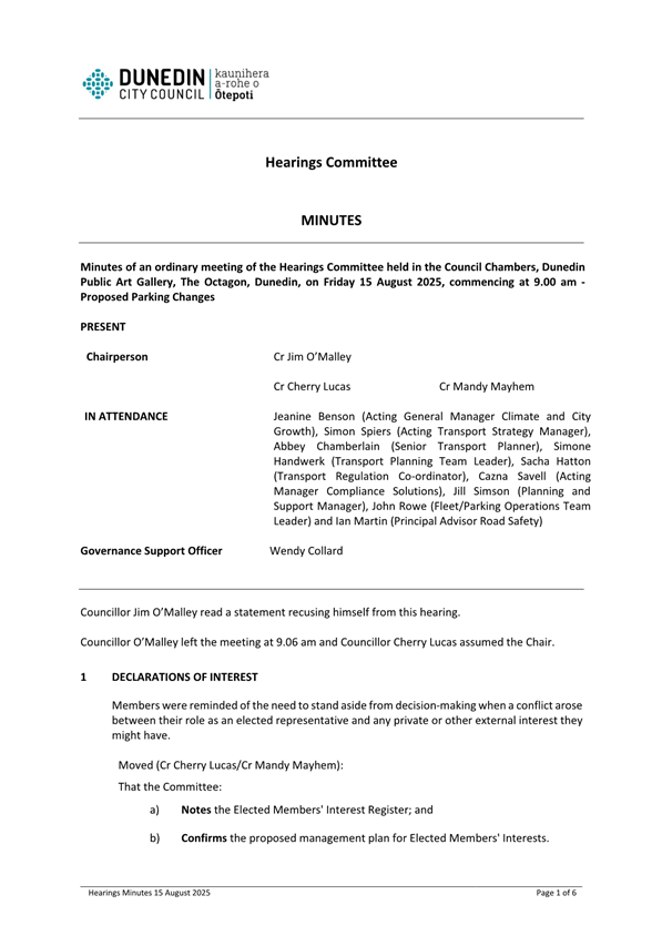1 This report presents recommendations of the Hearings Committee meeting (Attachment A - Minutes of Hearings Committee meeting) held on 15 August 2025 on proposed changes to parking, turning and one-way restrictions.