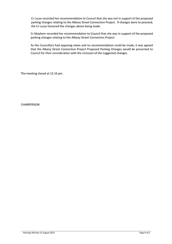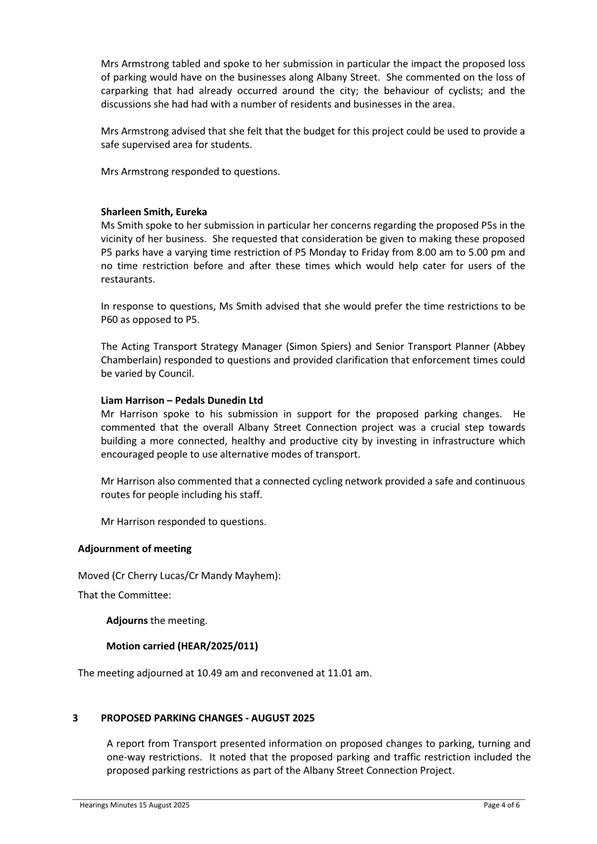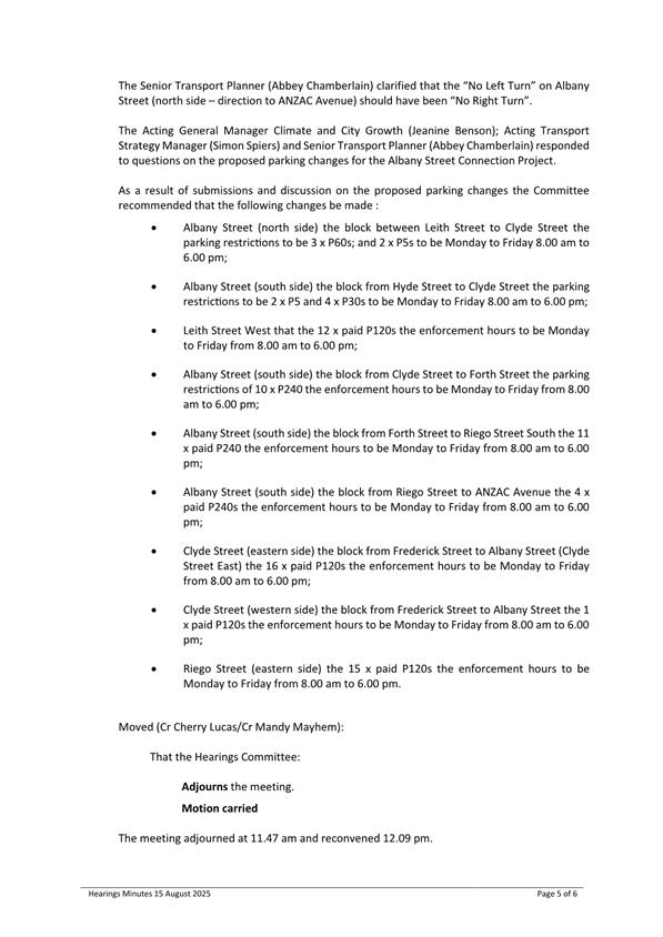 5 Seven people spoke to submissions at the Committee meeting relating to the Albany Street Connection Project parking regulation changes.