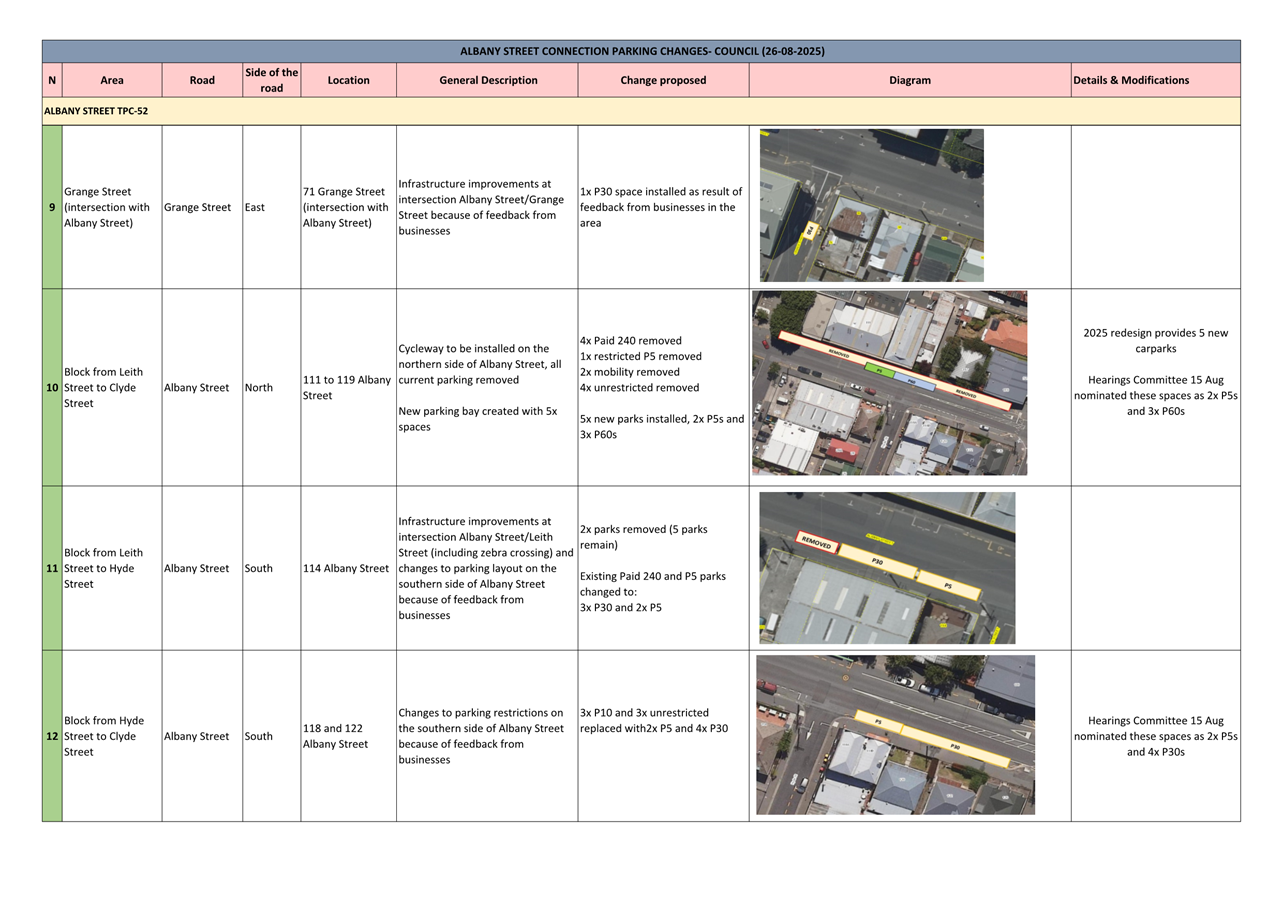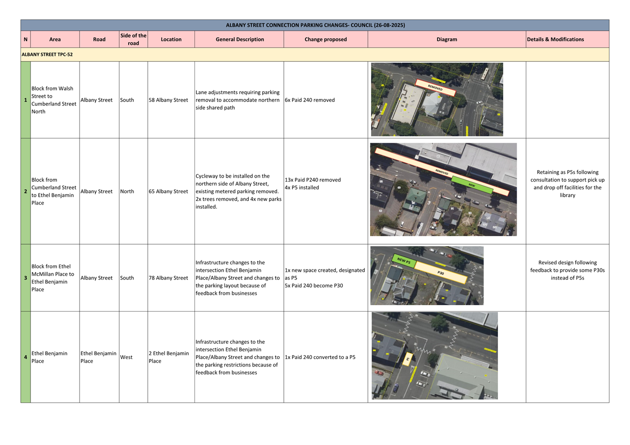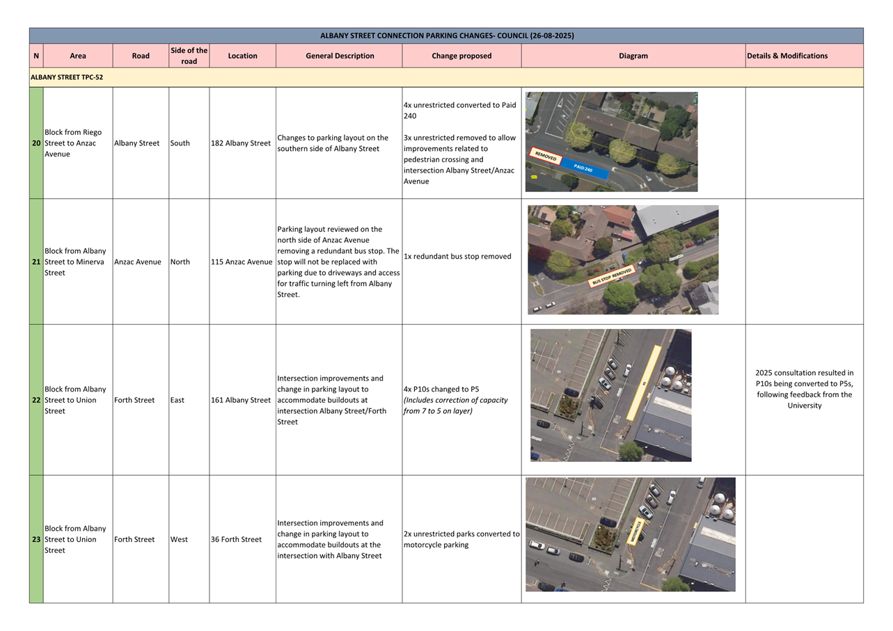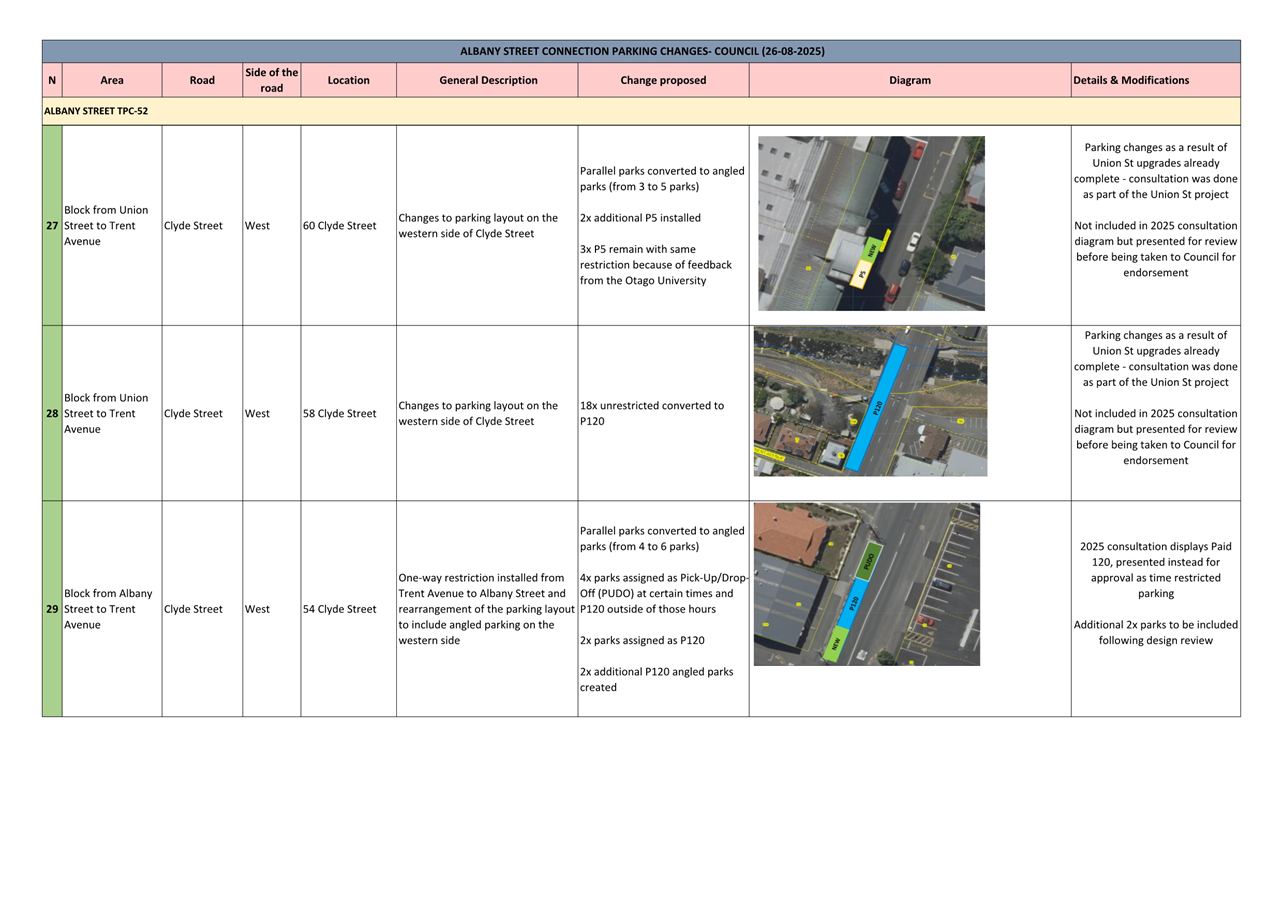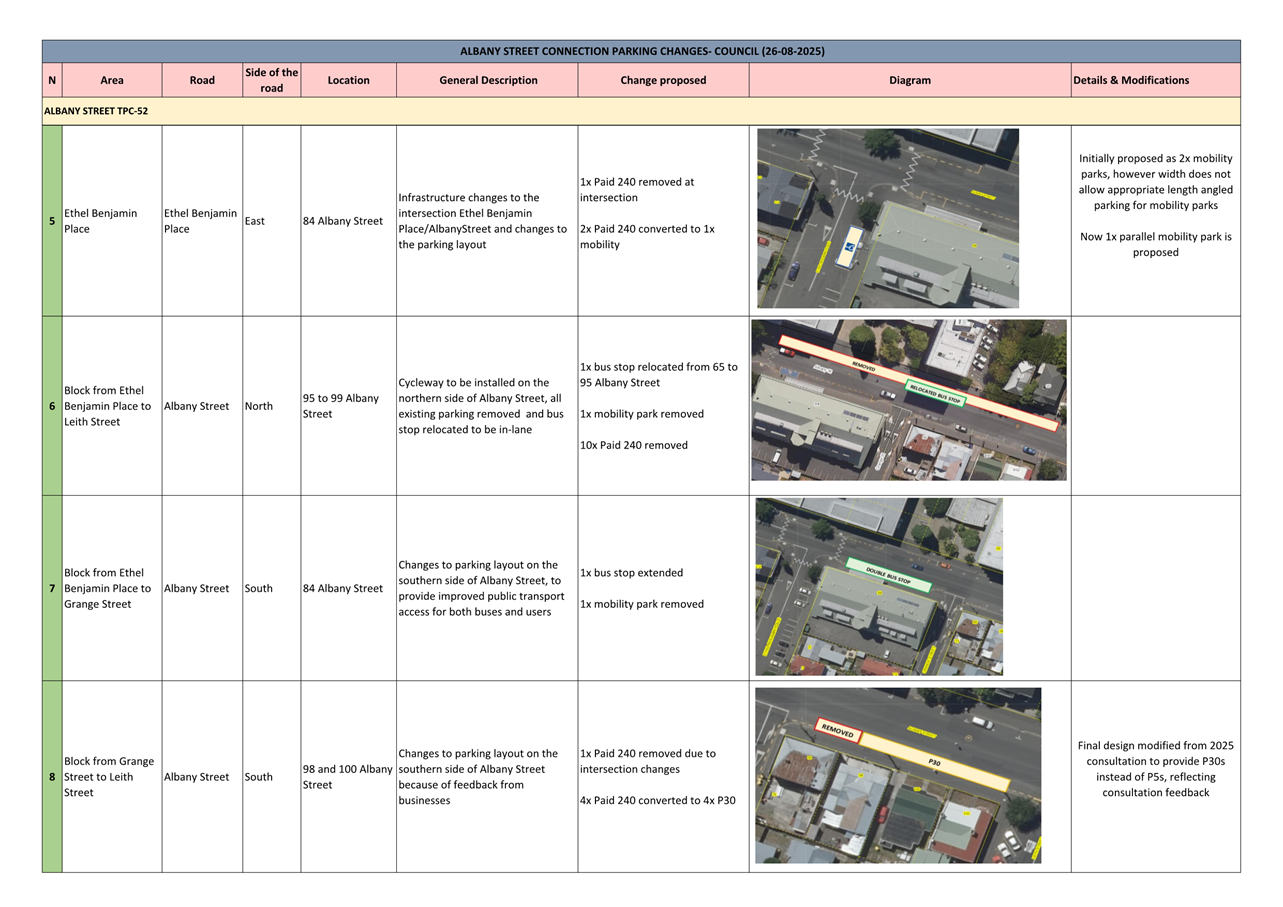 c) Adopts the proposed changes to parking and traffic restrictions proposed for the Albany Street Connection Project, as shown in this report and the August 2025 update of the Dunedin City Council's traffic and parking restrictions database: Dunedin Parking Controls - August 2025 - TPC 52.