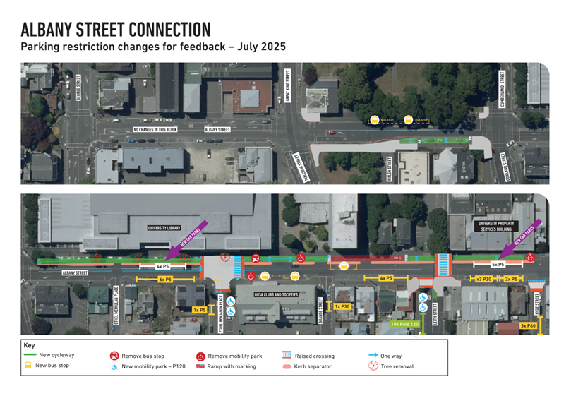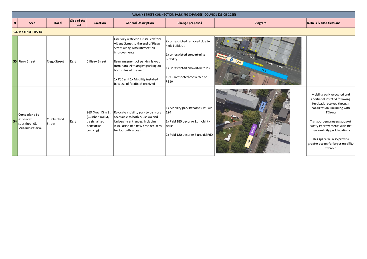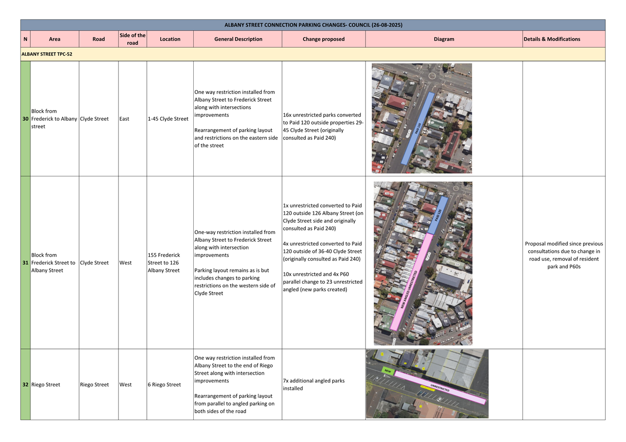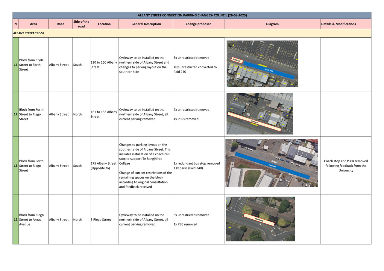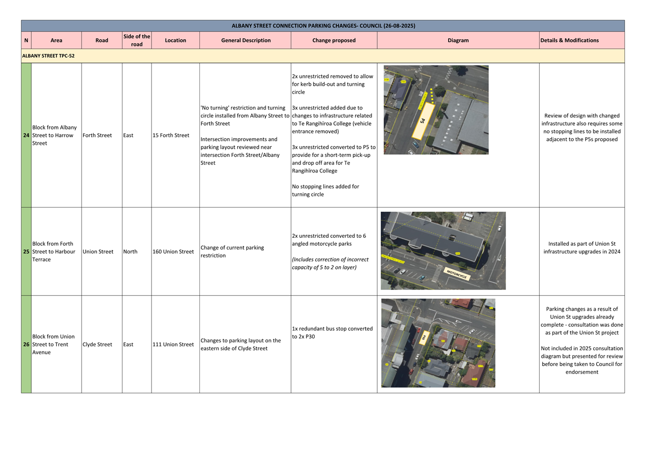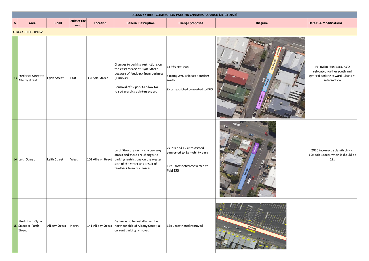 c) Adopts the proposed changes to parking and traffic restrictions proposed for the Albany Street Connection Project, as shown in this report and the August 2025 update of the Dunedin City Council's traffic and parking restrictions database: Dunedin Parking Controls - August 2025 - TPC 52.
