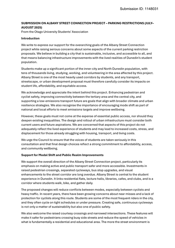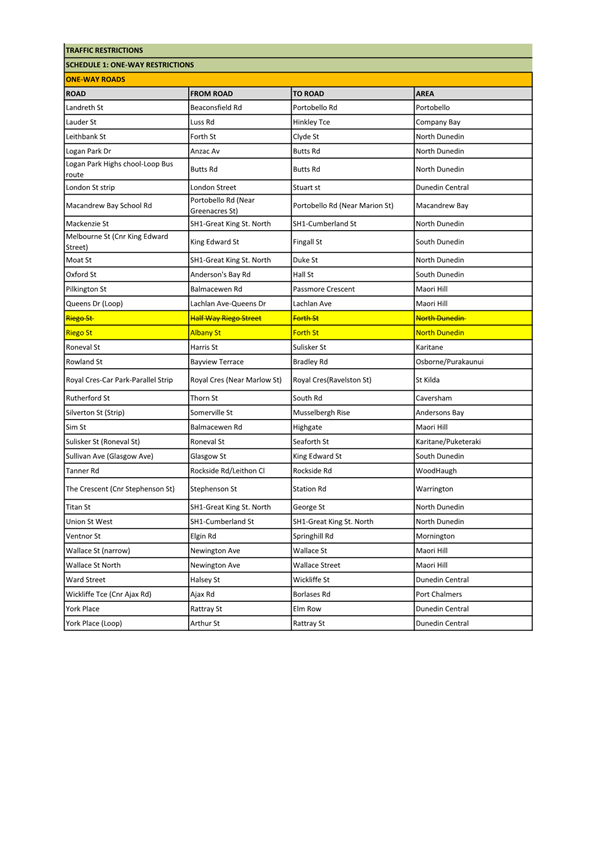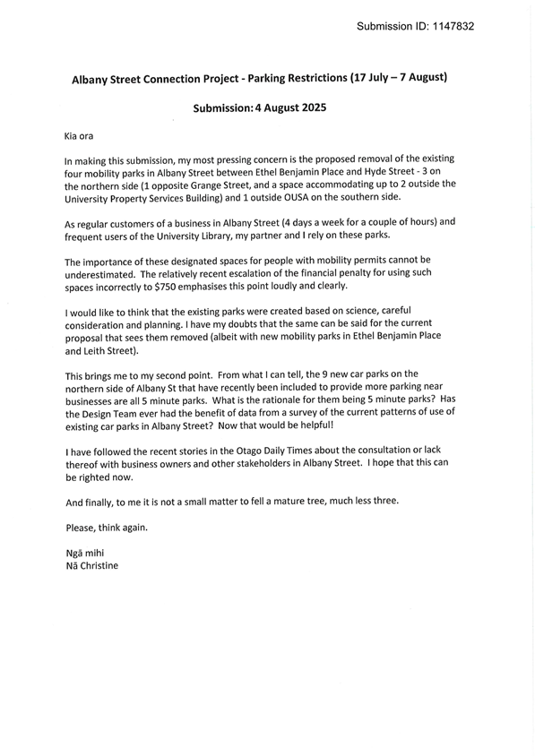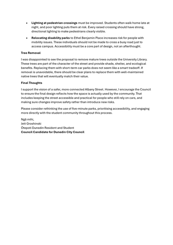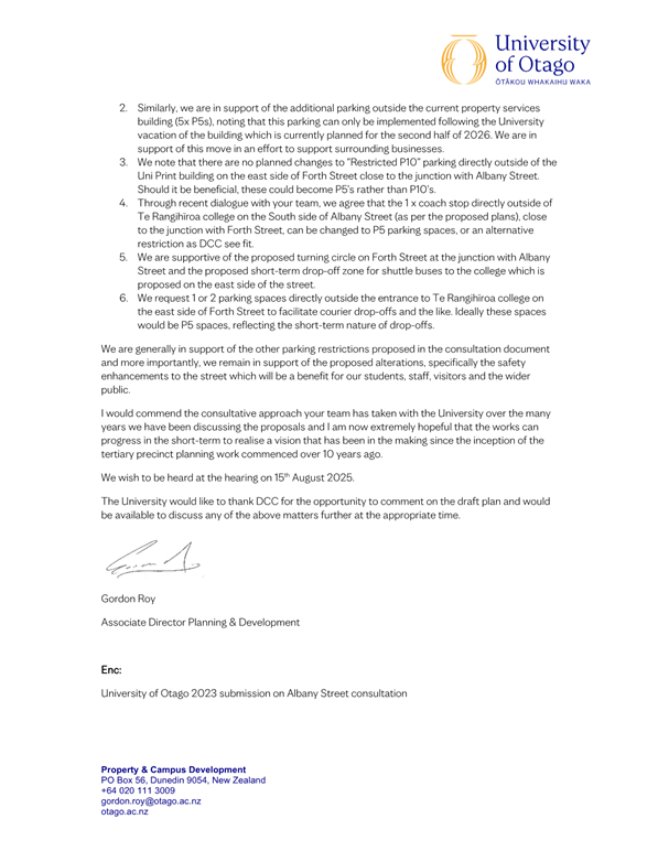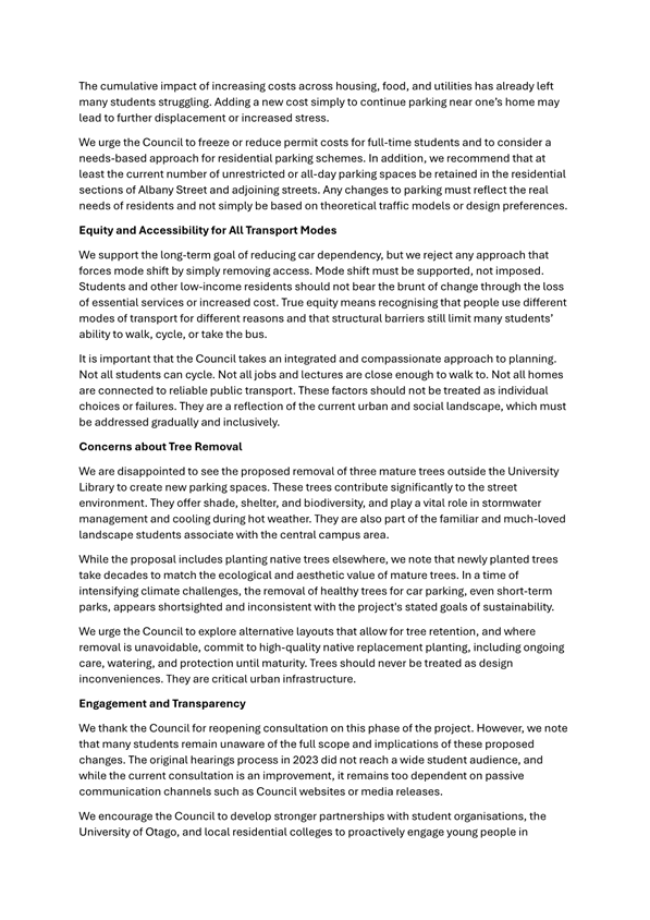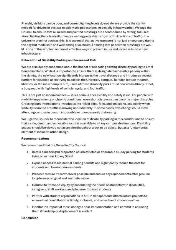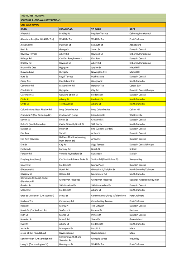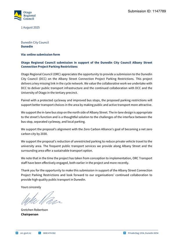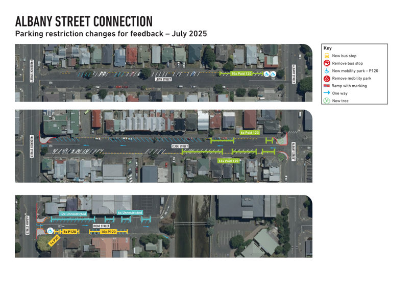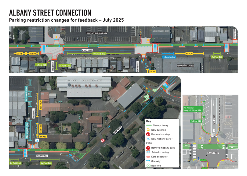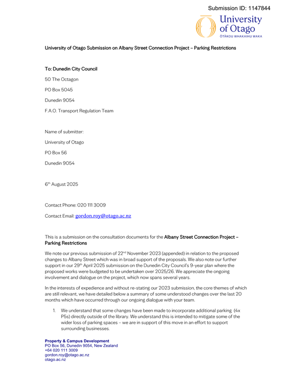 c) Adopts the proposed changes to parking and traffic restrictions proposed for the Albany Street Connection Project, as shown in this report and the August 2025 update of the Dunedin City Council's traffic and parking restrictions database: Dunedin Parking Controls - August 2025 - TPC 52.