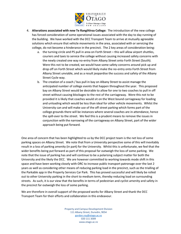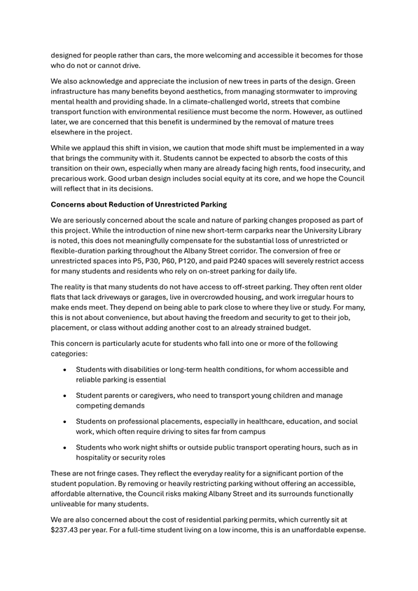 8 Although 48 carparks will be lost through the Albany Street Connection Project, staff have already worked to reduce this number from 68 carparks and will continue to seek to identify other opportunities in the vicinity of the University to offset parking loss through the Albany Street Connection Project (e.g. through the implementation of further one-way streets in the vicinity of the University with angle parking.