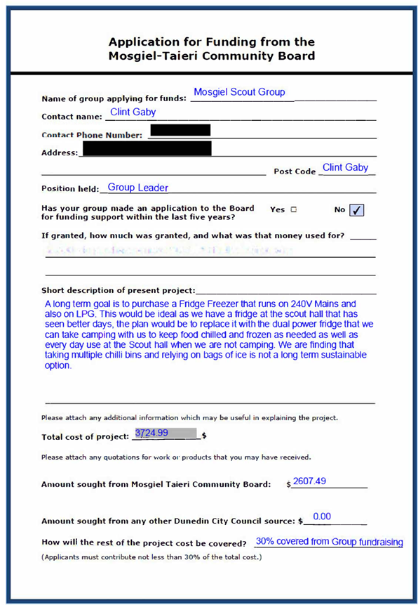 Mr Clint Gaby, Mosgiel Scouts Group Leader, will speak to a funding application from Scouting Mosgiel for support to purchase of a fridge to take on Scout camping trips.